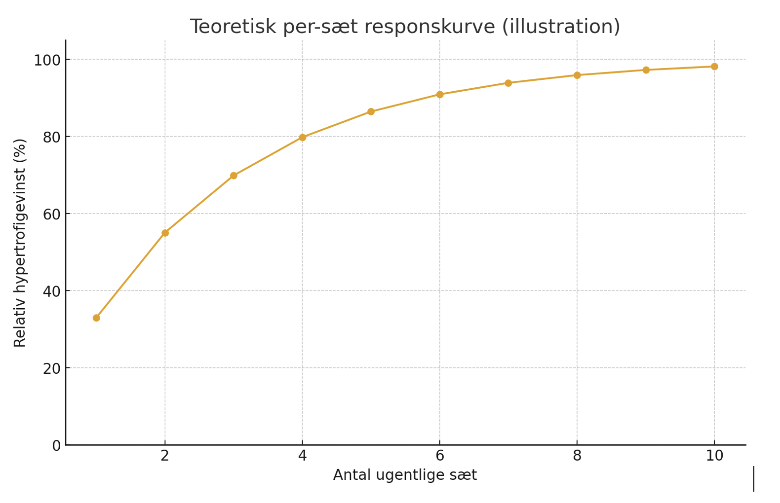 Baseret på dosis–respons litteraturen kan gevinsterne forestilles som en kurve med stor effekt af det første sæt og gradvist mindre gevinst ved højere volumen. Figuren illustrerer denne hypotetiske udvikling. Det er en pædagogisk model, ikke et direkte empirisk fund.